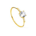 Anillo para mujer. Fabricado en oro amarillo 18 ktes. Modelo en garras. Acabado brillo. Piedras circonitas y topacios 0,53 ctes. Grosor de ancho 1 mm. Talla 13. Certificado de garantía y de calidad. Se presenta en estuche y bolsa.