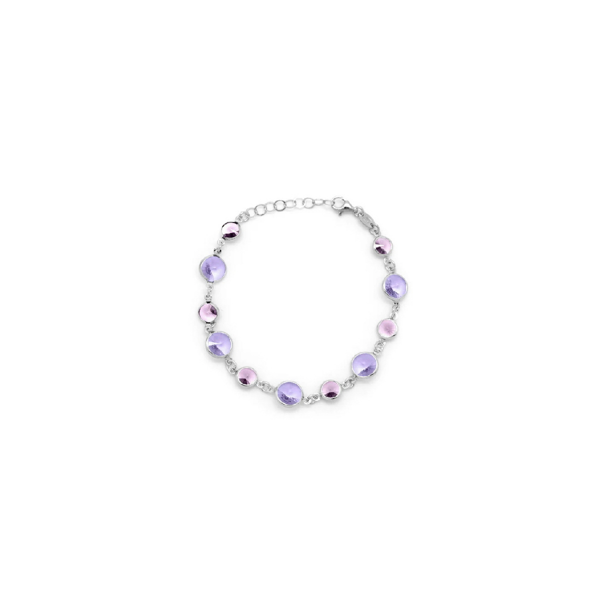 Pulsera para mujer VICTORIA CRUZ. Fabricada en plata d eley 925 mm. Acabado brillo rodio. Piedras cristales en tonos morados y malvas tamaño 6 y 8 mm. Cierre mosquetón. Medida 18/20 cm. Se presenta en estuche y bolsa.