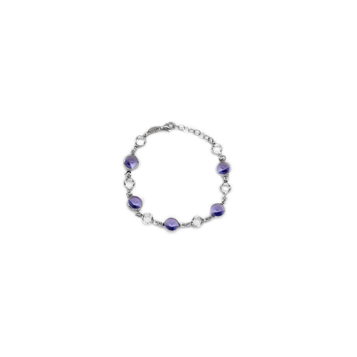 Pulsera para mujer VICTORIA CRUZ. Fabricada en plata de ley 925 mm. Acabado brillo rodio. Cristales colores en malva y blancos. Tamaño cristales 6 y 8 mm. Cierre mosquetón. Medida 18/20 cm. Se presenta en estuche y bolsa.