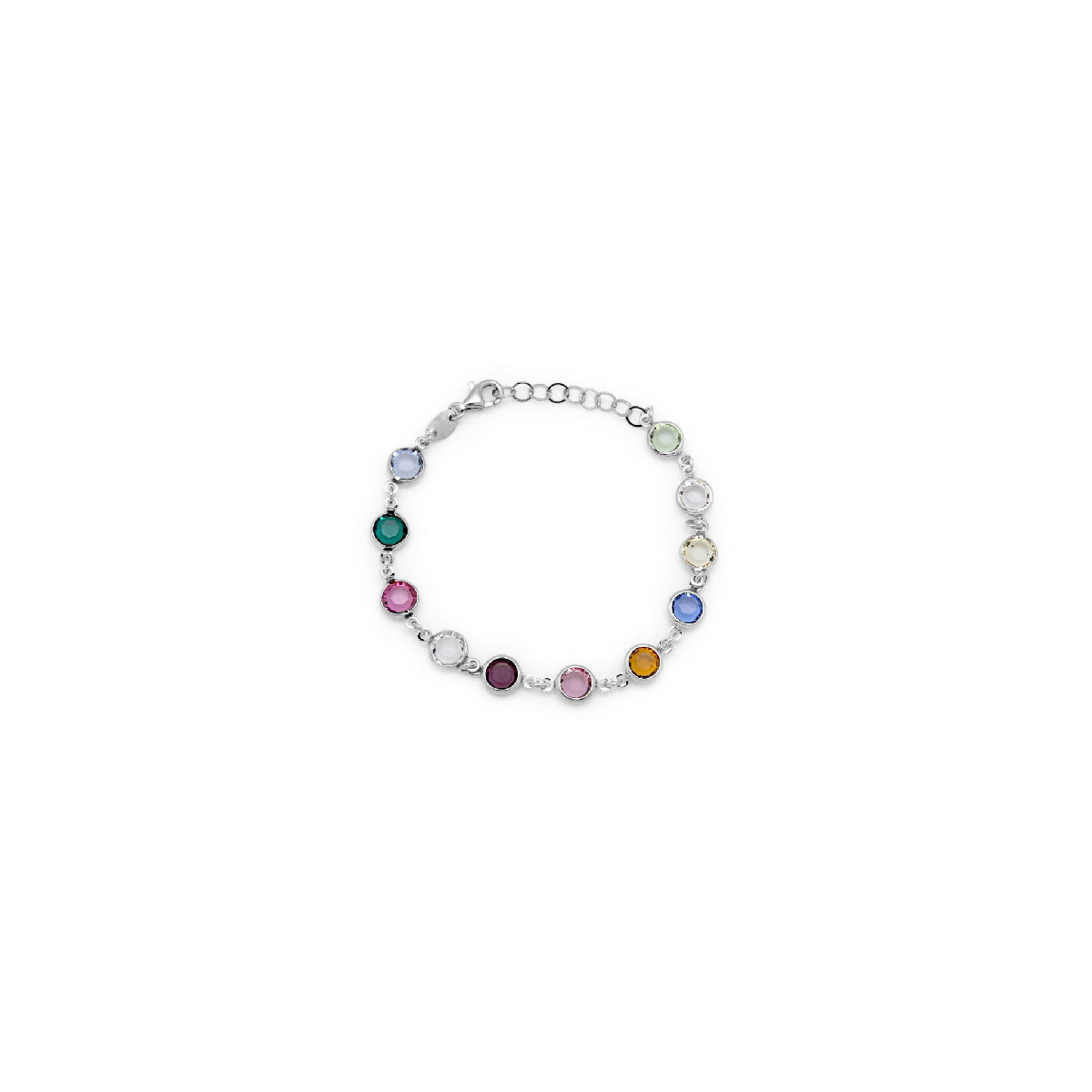 Pulsera para mujer VICTORIA CRUZ. Fabricada en plata de ley 925 mm. Acabado brillo rodio. Piedras cristales colores. Tamaño piedras 7 mm. Cierre mosquetón. Medida 18/20 cm. Certificadpo de garantía. Se presenta en estuche y bolsa.