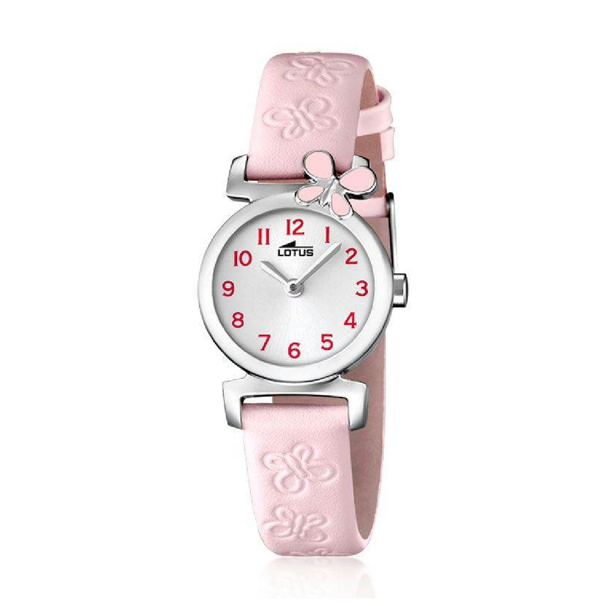 Reloj parar niñas LOTUS. Colección junior. Cuarzo analógico. Caja acero. Correa cuero color rosa. Motivo mariposa. Tamaño 24 mm. Resiistente al agua 3 atm. Garantia 3 años. Se presenta en estuche y bolsa.