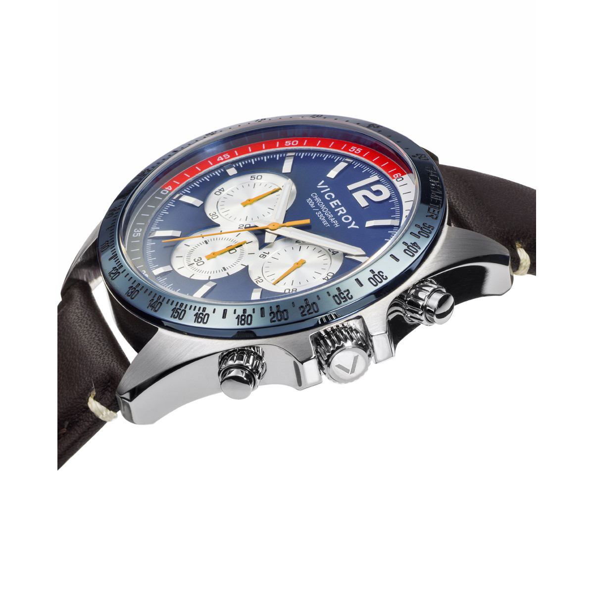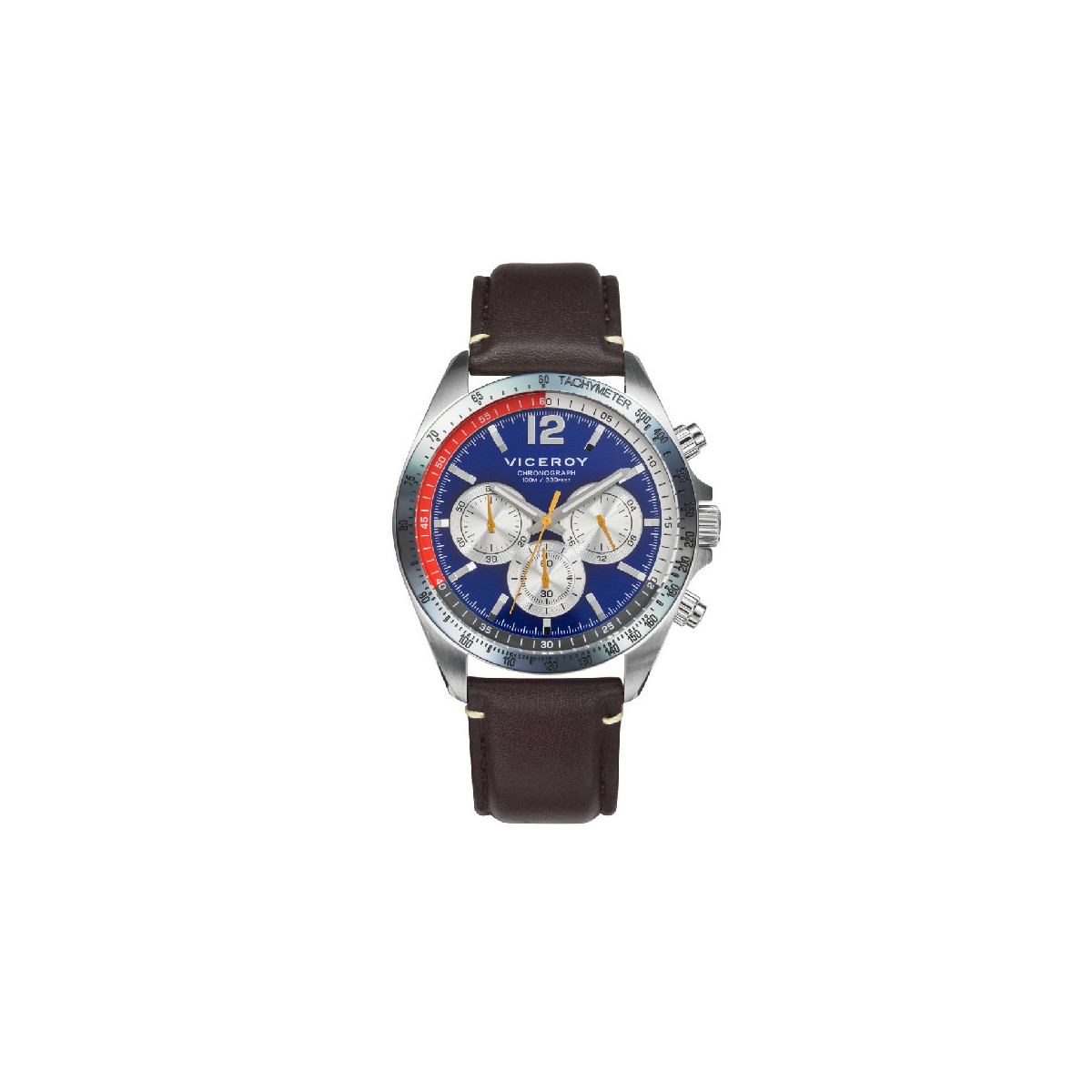 Reloj para hombre VICEROY. Cuarzo crono. Caja acero. Correa cuero color marrón. Bisel acero IP azul. Tamaño 42 mm. Resistente al agua 100 m. Garantía del fabricante 3 años. Se presenta en estuche y bolsa